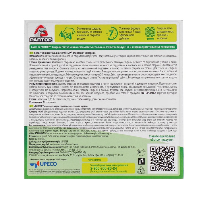 Если во время отдыха вам не дают расслабиться назойливые насекомые, проблему решат спирали от комаров РАПТОР® Средство удобно использовать, когда поблизости нет источников электричества. Оно отличается высокой эффективностью, большим радиусом действия, безопасностью для людей и животных.Спираль от комаров РАПТОР® представляет собой пропитанную d-аллетрином основу из плотно спрессованной древесной муки. Принцип действия предельно прост: при сгорании спирали выделяется дым, который обеспечивает фумигацию активного вещества. Активное вещество, попадая в воздух, убивает комаров, москитов и мошек в радиусе до трех метров. Для использования спиралей вам не потребуется дополнительных устройств. Все, что нужно – подставка-держатель – уже содержится в упаковке.Спираль от комаров без запаха не причиняет вред человеку и домашним животным*.D-alletrin (d-аллетрин) – инсектицид нового поколения, предназначен для защиты человека от мух, комаров и других насекомых. D-alletrin оказывает на насекомых нервнопаралитическое действие. Воздействие вещества в течение длительного времени блокирует нервную проводимость и приводит к гибели насекомого. Эффект становится заметен уже через 10 – 15 минут.ИНСТРУКЦИЯИзвлеките спирали из упаковки и осторожно разъедините. Аккуратно отогните стойку на металлической подставке и плотно закрепите на ней спираль. Для этого на спирали предусмотрена специальная прорезь. Осторожно подожгите конец спирали и задуйте пламя. Действие средства начинается через 10-15 минут после начала тления. Спираль будет защищать вас от комаров в течение 7 часов непрерывной работы.