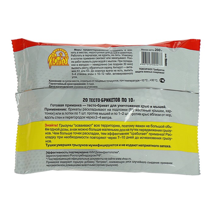Применение: брикеты раскладывают на подложки (б/у жестяные крышки, картонки) или в лотки по 1 шт. против мышей и по 1–2 шт. против крыс вблизи от нор, вдоль стен и перегородок через 2–4 метра.