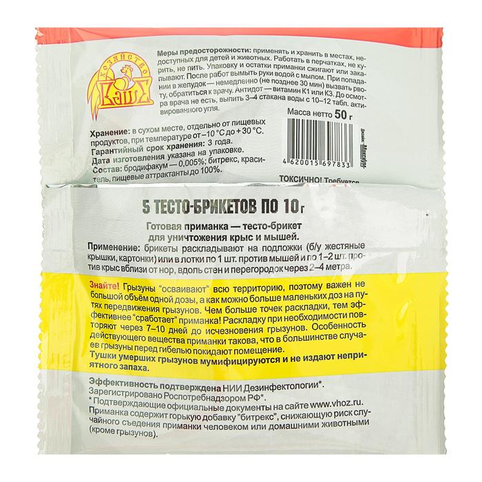 Состав тесто-брикетов включает в себя бродифакум (0,005%), который является мощным антикоагулянтом, вызывающим нарушение свертываемости крови у грызунов. Также в состав входят битрекс, краситель и пищевая основа, обеспечивающие привлекательный внешний вид и привлекательный аромат для целевой аудитории. Это позволяет добиться максимальной эффективности приманки и обеспечить быстрое и надежное уничтожение грызунов.