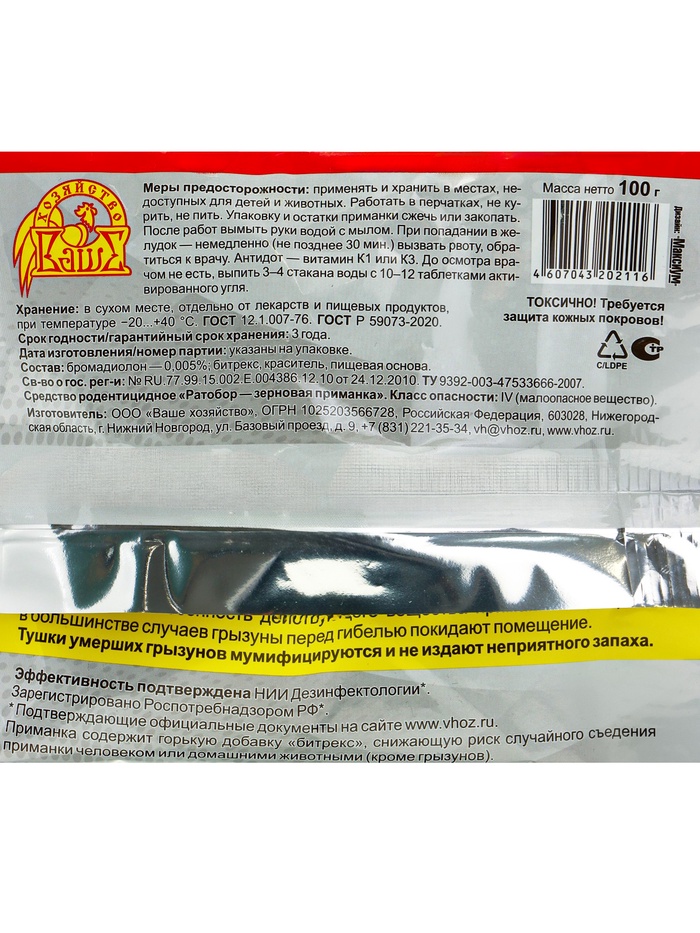 Меры предосторожности: применять и хранить в местах, недоступных для детей и животных. Работать в перчатках, не курить, не пить. Упаковку и остатки приманки сжигают или закапывают. После работ вымыть руки водой с мылом. При попадании в желудок — немедленно (не позднее 30 мин) вызвать рвоту, обратиться к врачу. Антидот — витамин К1 или К3. До осмотра врача не есть, выпить 3–4 стакана воды с 10–12 таблетками активированнго угля.