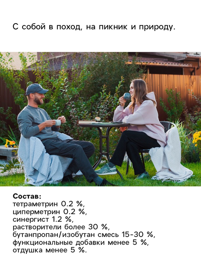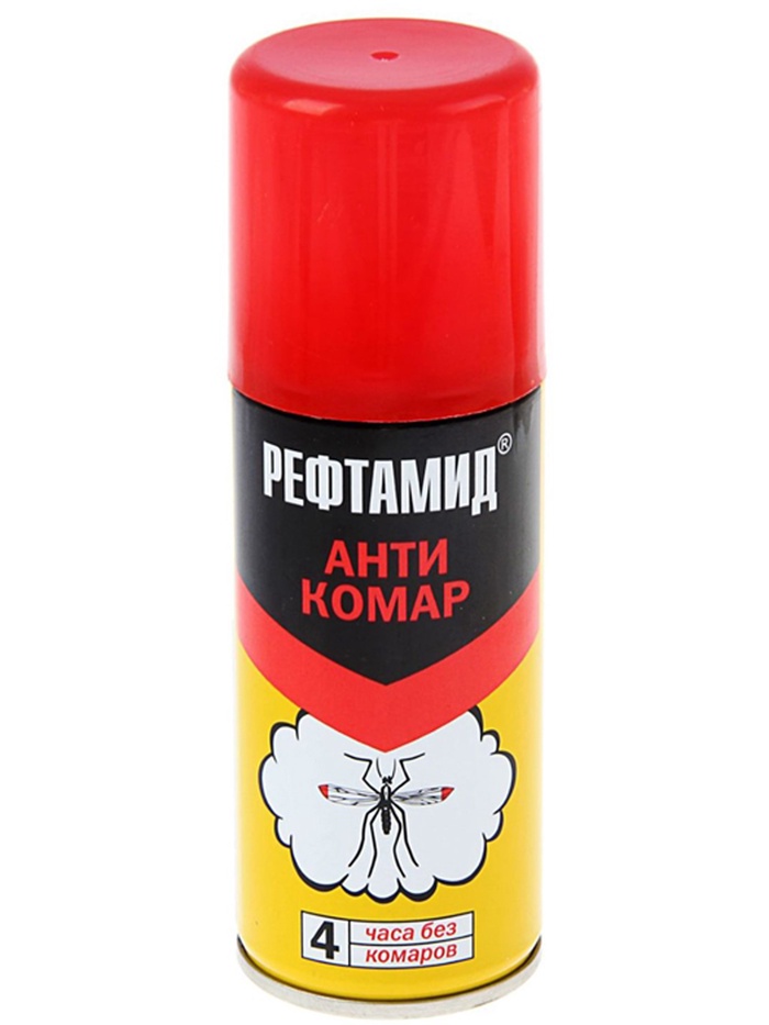 ОписаниеРефтамид от комаров ''Антикомар'' предназначен для обработки открытых частей тела, одежды, а также занавесок, сеток на окнах и дверях с целью защиты от кровососущих насекомых: комаров, мокрецов, мошек и слепней. Содержит высокоэффективный действующий компонент и сохраняет своё действие в течение 4 часов. Средство наносится на одежду и открытые части тела. Надежно защищает от комаров и работает в любой местности, особенно на природе.Способ применения: перед использованием встряхните. Распыляйте средство на ладонь и наносите на открытые участки тела. Одежду обрабатывайте на открытом воздухе в защищённом от ветра месте с расстояния 20 ‒ 25 см. Для обработки одежды одному человеку использовать не более 1 баллона в сутки. Повторную обработку проводить не чаще чем через 3 – 5 суток.Меры предосторожности: берегите от детей. Храните средство вдали от источников огня. Не вдыхайте, не допускайте попадания в глаза и рот, а также на повреждённые участки кожи. При отравлении обратитесь к врачу. При попадании в глаза промойте их водой.Храните средство отдельно от пищи в местах, недоступных для детей, при температуре от 0 °C до + 30 °C и вдали от источников огня.СоставN,N-диэтил-м-толуамид (ДЭТА) 15,75%, диметилфталат 13,5%, бутан/пропан/изобутан смесь >30%, спирт этиловый денатурированный 15-30%, глицерин