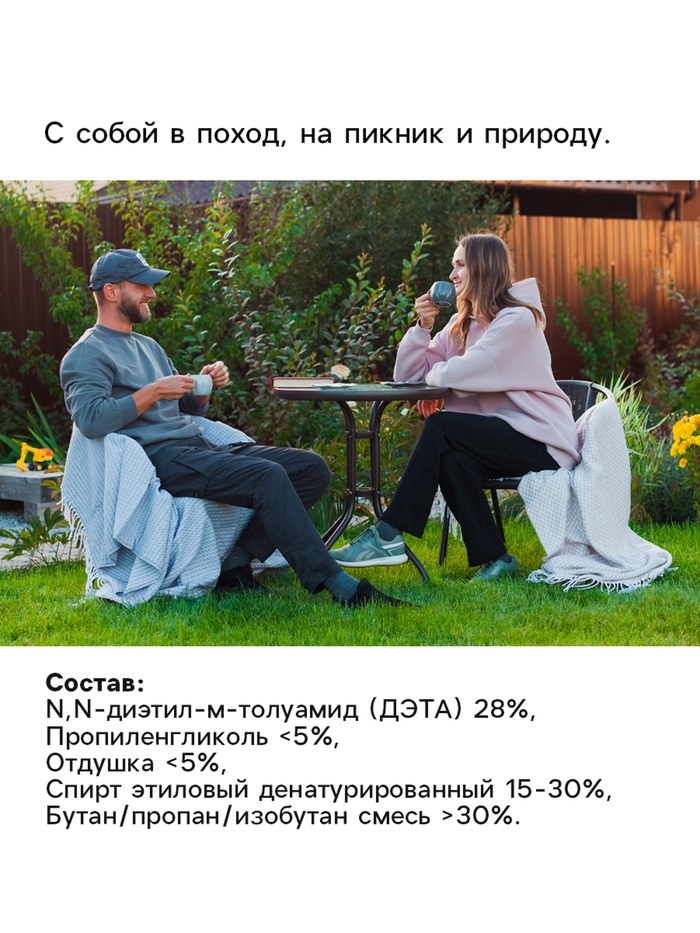 Репеллентный аэрозоль "Рефтамид" Максимум 3 в 1, объемом 100 мл, предназначен для защиты от насекомых, в том числе от клещей. Средство содержит N,N-диэтил-м-толуамид (ДЭТА) в концентрации 28%, пропиленгликоль в количестве менее 5%, отдушку также менее 5%, денатурированный спирт этиловый в диапазоне от 15% до 30% и смесь бутана, пропана и изобутана свыше 30%.Рекомендуется наносить аэрозоль на кожу не чаще одного раза в сутки. Для обработки одежды одному человеку следует использовать не более одного баллона в день. Повторную обработку необходимо проводить не ранее, чем через 3-5 дней. Важно отметить, что данное средство обеспечивает неполную защиту от клещей.При использовании репеллента необходимо соблюдать меры предосторожности. Не рекомендуется наносить аэрозоль на поврежденную кожу, а также на кожу лица и шеи. При попадании в глаза следует тщательно промыть их большим количеством воды. Не допускайте попадания средства на открытые огонь и источники тепла.В случае возникновения аллергических реакций на компоненты репеллента необходимо немедленно прекратить его использование и обратиться за медицинской помощью.