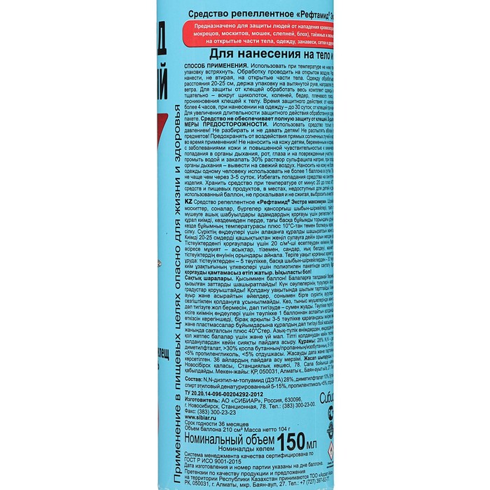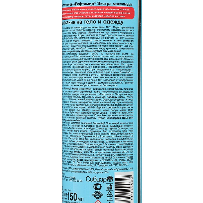 ОписаниеРефтамид УСИЛЕННЫЙ Максимум — репеллентное средство для эффективной борьбы с кровососущими насекомыми.В его состав входят увеличенные количества действующих веществ, обеспечивающие более длительную (5 часов) и надёжную защиту от комаров, мокрецов, москитов, мошек, слепней, блох, а также от таёжных и лесных клещей.СПОСОБ ПРИМЕНЕНИЯ Перед применением баллон встряхивать 2-3 с. Средство распылить на ладонь и нанести, не втирая, на открытые части тела, одежду и другие изделия из ткани обрабатывать на открытом воздухе. Средство распылять на изделия с расстояния 20-25 см от них. После обработки одежду просушить. На территории, опасной по клещевому энцефалиту, правильно одевайтесь: брюки заправляйте в сапоги или носки с плотной резинкой, рубашку или куртку-в брюки, манжеты рубашки или куртки должны плотно прилегать к запястью.СоставN,N-диэтил-м-толуамид (ДЭТА) 15,75%, диметилфталат 13,5%, бутан/пропан/изобутан смесь >30%, спирт этиловый денатурированный 15-30%, глицерин