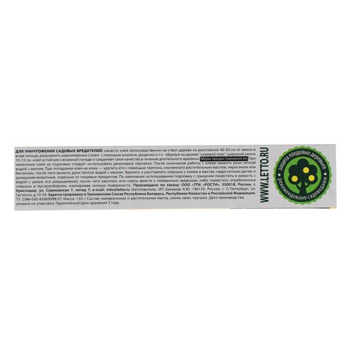 Для уничтожения садовых вредителей: нанести клей непосредственно на ствол дерева на расстоянии 40-50 см от земли в виде кольца, разровнять равномерным слоем с помощью шпателя, дощечки и т.п. образуя на дереве "клеевой пояс" шириной около 10-15 см. клей устойчив к влажной погоде и сохраняет свои качества в течение длительного времени.