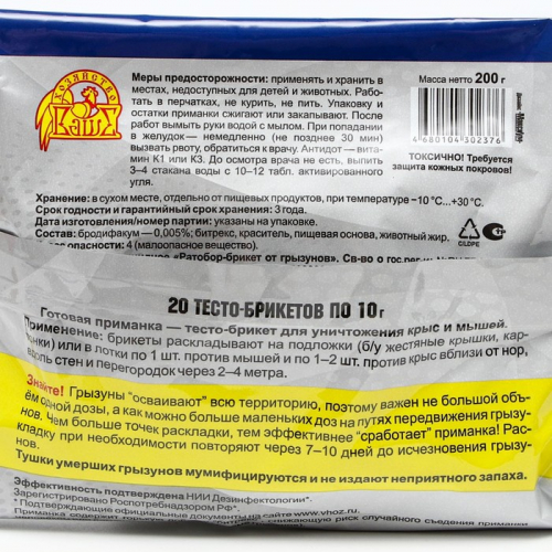Расход: 1 брикет на 1 мышь и 2-3 брикета на 1 крысу. Для предотвращения случайного отравления человека и домашних животных в состав брикетов введена горечь.