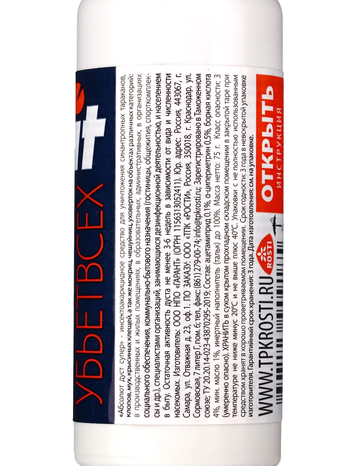 «Абсолют дуст супер» - инсектоакарицидное средство для уничтожения синантропных тараканов, клопов, мух, крысиных клещей, а так же мокриц, чешуйниц, уховерток на объектах различных категорий: в производственных и жилых помещениях, в образовательных, административных, в организациях социального обеспечения, коммунально-бытового назначения (гостиницы, общежития, спорткомплексы и др.), специалистами организаций, занимающихся дезинфекционной деятельностью, и населением в быту. Остаточная активность дуста не менее 3-6 недель в зависимости от вида и численности насекомых.СПОСОБ ПРИМЕНЕНИЯ: Нанести дуст тонким слоем на места обитания, скопления, или передвижения насекомых. Повторные обработки при появлении насекомых.Для уничтожения: МУХ – места их выплода: мусорокамеры в подвалах, емкости для сбора мусора и контейнеры – вне помещений; ТАРАКАНОВ – отверстия и щели в стенах, дверных коробках, порогах, щели вдоль плинтусов, облицовочных покрытий, вентиляционные отдушины, места разрушений на вводе и выводе труб водопроводной, отопительной и канализационной систем, под раковинами. При большой численности насекомых обрабатывают и смежные помещения в целях предотвращения заселения их тараканами; МУРАВЬЕВ – обработать ванные, душевые, котельные. При обнаружении садовых муравьев на нижних этажах построек обрабатывают крыльцо по периметру, отмостку дома, т.е. места проникновения муравьев в помещения извне из расчета 2-3 г/кв.м. Кухни и жилые комнаты не обрабатывать; КЛОПОВ – места возможного обитания насекомых: на участки стен, где есть трещины, в щели, за плинтусами, а также на заднюю поверхность мебели, деревянные части кровати и обратную сторону ковров и картин из расчета 2-3 г/кв.м. Постельные принадлежности не обрабатывать; БЛОХ – в нежилых помещениях, обрабатывая плинтусы, щели на поверхности пола (особенно в местах отставания линолеума) и за плинтусами Подстилки и коврики для животных, обработанные с нижней стороны, через сутки тщательно выбивают, а через 3 суток – стирают перед последующим использованием; КРЫСИНЫХ КЛЕЩЕЙ - обрабатывают, в первую очередь, места проникновения грызунов в помещения и пути их перемещения: лазы, трубы различных коммуникаций, плинтусы, стены и полы вдоль них. Затем места возможной концентрации клещей: обогреваемые участки стен и полов около отопительных приборов и тепловых коммуникаций. При наличии фальшпокрытий, за которыми могут перемещаться грызуны, потолки и стены так же подлежат обработке; МОКРИЦ, УХОВЕРТОК, ЧЕШУЙНИЦ – подвалы, бойлерные, душевые, котельные и другие влажные помещения. Ввиду высокой чувствительности этих видов к инсектицидам они погибают в течение нескольких часов.Действующее вещество ацетамиприд 0,1%, α-циперметрин 0,5%