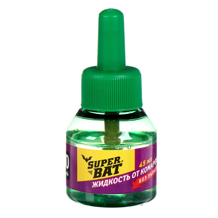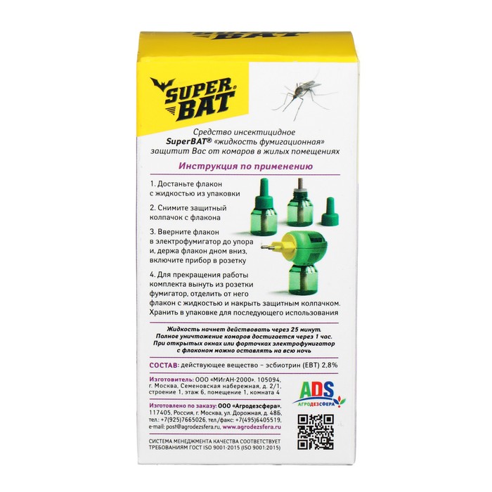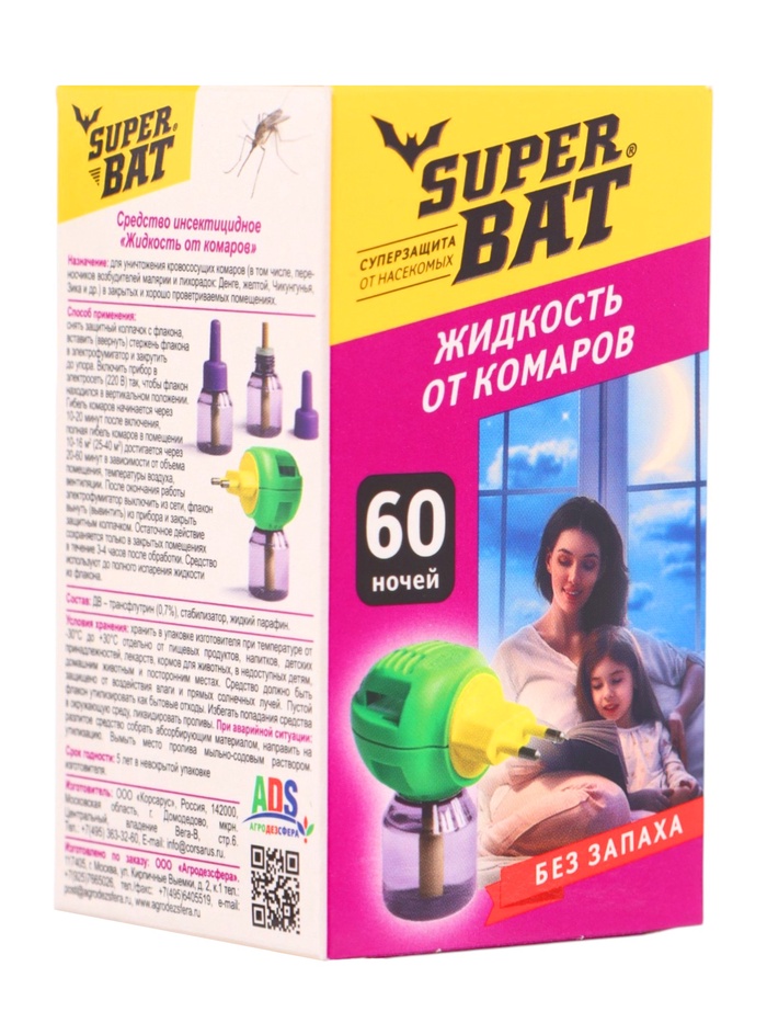 Дополнительный флакон к электрофумигатору для уничтожения комаров в помещениях. Увеличенный объем избавляет от насекомых на 60 ночей!При использовании универсального электрического фумигатора «SuperBat», достаньте из коробки флакон с жидкостью от комаров «SuperBat», отверните защитный колпачок.Вставьте флакон в электрический фумигатор «SuperBat» и плотно прикрутите.Включите прибор в электросеть, поверните вилку прибора так, чтобы флакон располагался вертикально.При использовании противомоскитной пластины вынуть ее из упаковки и вложить в электрический фумигатор «SuperBat». Вилку повернуть согласно розетке и включить прибор в электросеть на 220 Вольт.Средство начинает действовать через 10-15 минут после включения.Уничтожение комаров достигается за 1-2 часа.При открытых на ночь окнах и форточках электрический фумигатор «SuperBat» с флаконом или пластиной оставьте включенным на всю ночь для уничтожения залетающих комаров.Запрещается одновременное применение флакона с жидкостью и пластины.Составпраллетрин 0,7%,растворитель,стабилизатор