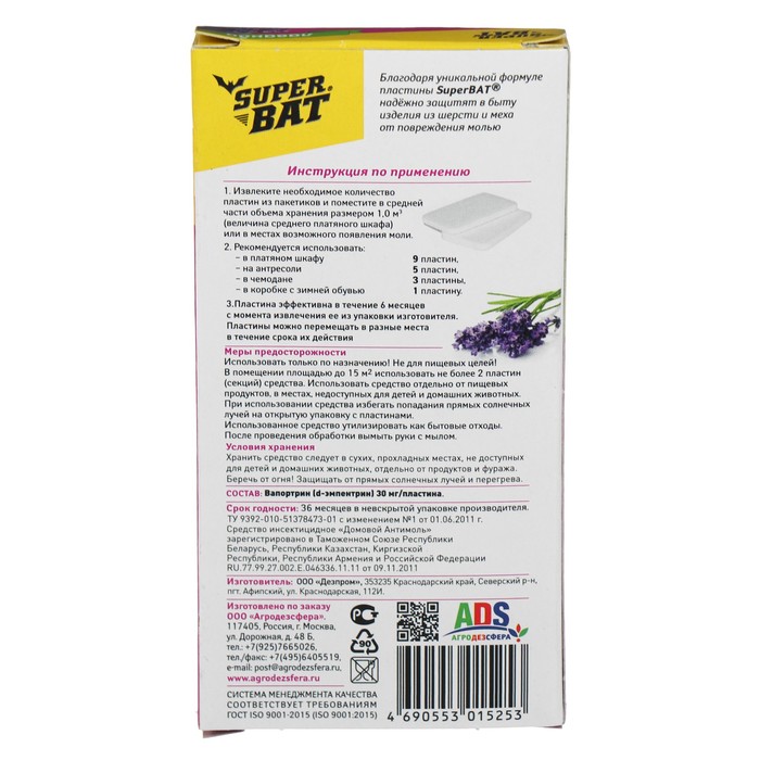 Пластины от моли SuperBAT надежно защитят в быту изделия из шерсти и меха от повреждений молью.Инструкция по применению: извлеките необходимое количество пластин из пакетиков и поместите в средней части объема хранения 1 м. куб. (величина среднего платяного шкафа) или местах возможного появления моли. Рекомендуется использовать: в платяном шкафу, на антресолях, в чемодане, в коробке с зимней обувью. Пластина эффективна в течение 6 месяцев с момента извлечения из упаковки. Пластины можно перемещать в разные места в течение срока их действия.Меры предосторожности: использовать только по назначению! Не для пищевых целей! В помещении площадью не более 15 кв.м. использовать не более 2-х пластин. Использовать средство отдельно от пищевых продуктов, в местах, недоступных для детей и домашних животных. Избегать попадания прямых солнечных лучей на открытую упаковку с пластинами. Использованное средство утилизировать как бытовые отходы. После проведения обработки вымыть руки с мылом.Действующее вещество: выпортрин (d- эмпентрин) 30 мг/пластина.