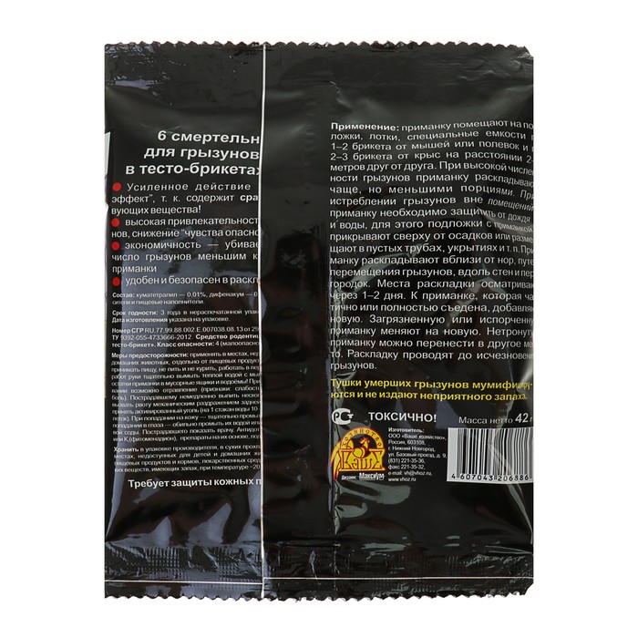 Применение: приманку помещают на подложки, лотки, специальные емкости по 1—2 пакетика от мышей или полевок и по 2—3 пакетика от крыс на расстоянии 2—5 метров друг от друга. При высокой численности грызунов приманку раскладывают чаще, но меньшими порциями.