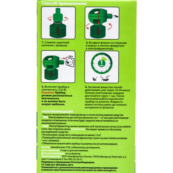Жидкостный наполнитель 30 ночей. Жидкостный наполнитель для фумигатора - универсальное и удобное в использовании средство для борьбы с комарами. В помещении общим объемом около 60 кубических метров средство начинает работать уже через 15 минут. Для полного уничтожения комаров требуется приблизительно не более 1 часа. Отвинтить у флакона пластмассовую крышку, вставить стержень внутрь фумигатора и закрепить до упора. Включить прибор в электрическую сеть (220В) так, чтобы флакон находился в вертикальном положении. Полная гибель насекомых достигается за 15-60 минут в зависимости от вида и площади помещения. Состав: трансфлутрин, стабилизатор, растворитель