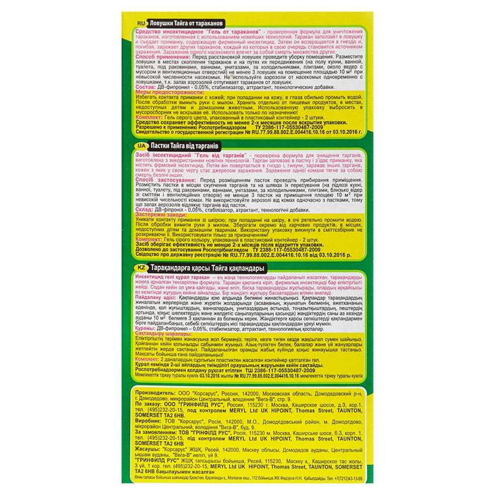 Клеевая ловушка ТАЙГА - мощное и эффективное, без запаха для быстрого уничтожения тараканов в Вашем доме или квартире. Помимо клея, в составе средства используется профессиональный нетоксичный феромон, привлекающий насекомых, которые приходят на его запах и прилипают на наклейку намертво. Абсолютно безвредно для человека и домашних животных. "Домик" идеален для применения там, где опасно оставлять отраву в виде таблеток, порошков, гранул: например в детских садах, школах или больницах . Они просты в применении и могут быть установлены в любом месте, в том числе в местах хранения пищевых продуктов. Вскрытые ловушки липучки сохраняют активность в течении трех месяцев, обеспечивая защиту против непрошенных гостей.Состав:Клей постоянной липкости, вкусо-ароматическая приманка, влагостойкий картонСпособ применения: аккуратно откройте ловушку, отделите бумагу, закрывающую клеевую поверхность, согните по линиям сгиба, сомкните замок с помощью фиксирующего клапана, установите ловушку возле стены. Для достижения лучшего результата рекомендуется использовать несколько ловушек одновременно.