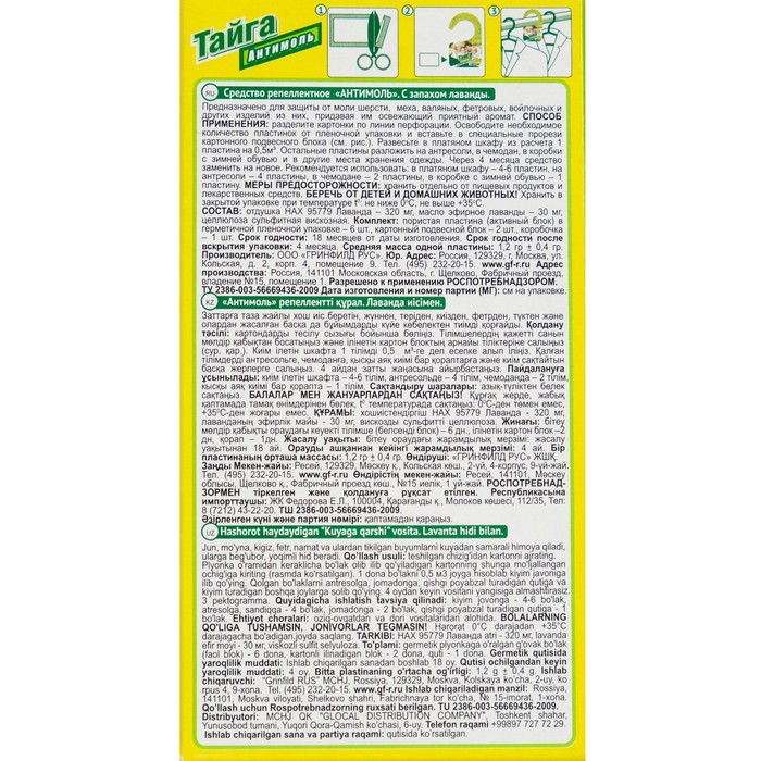 Описание Тайга Антимоль (подвесной блок) – продукт российской корпорации, производящей на собственном оборудовании моюще-дезинфицирующие средства, бытовую химию, инсектициды. Продукция компании ориентирована на широкий круг потребителей. Под брендом Тайга выпускается средства, предназначенные для борьбы с насекомыми, репелленты, акарицидные препараты. В мягкой упаковке Тайга Антимоль содержится 2 вешалки и 6 пластин. Происходит распространение запаха смеси натуральных и синтетических веществ, отпугивающих имаго (взрослых особей) моли. Контейнеры удобны для использования в местах хранения верхней одежды.Состав:смесь природных эфирных масел;синтетические душистые вещества на основе HAX 95779 (отдушки);сульфатная вискозная целлюлоза.Способ применения Начинать борьбу с молью следует с обнаружения места ее обитания. Блоки Тайга Антимоль размещают в гардеробной, шкафу, на антресолях и других местах, где хранятся теплая одежда и обувь. Вещества, содержащегося в одной пластины, достаточно для защиты от моли объема 2м3. Одна пластина рассчитанная на использование в течение 6 месяцев, практически обеспечивает защиту от моли на весь период хранения одежды между сезонами.