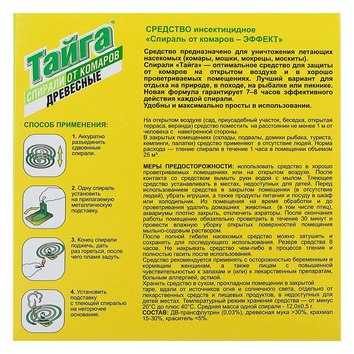 Средство инсектицидное «Спираль от комаров – ЭФФЕКТ».99,9% натуральный компонентов.10 спиралей + подставка. Без комаров на природе и в помещении.Средство предназначено для уничтожения летающих насекомых (комары, мошки, мокрецы, москиты).Спирали «Тайга» — оптимальное средство для защиты от комаров на открытом воздухе и в хорошо проветриваемых помещениях. Лучший вариант для отдыха на природе, в походе, на рыбалке или пикнике. Новая формула гарантирует 7–8 часов эффективного действия каждой спирали.Удобны и максимально просты в использовании.Состав: ДВ-трансфлутрин (0,03%), древесная мука >30%, крахмал 15-30%, краситель