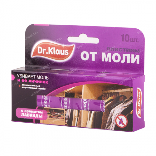 Dr.Klaus подвесная секция от моли– инсектицидное средство с ароматом лаванды. Применяется в бытовых целях для защиты изделий из шерсти и меха от повреждения молью. В качестве действующего вещества содержит трансфлутрин (0,8%), также в состав входит картонная основа. Препарат обладает не только отпугивающим, но и уничтожающими свойствами – убивает моль и ее личинок, кожеедов, эффективен в течение длительного времени – до 9 месяцев.• Средство хранить в плотной закрытой таре, вдали от огня, нагревательных приборов и воздействия прямых солнечных лучей, отдельно от пищевых продуктов, питьевой воды, фуража и лекарственных средств, в местах, недоступных для детей и домашних животных.