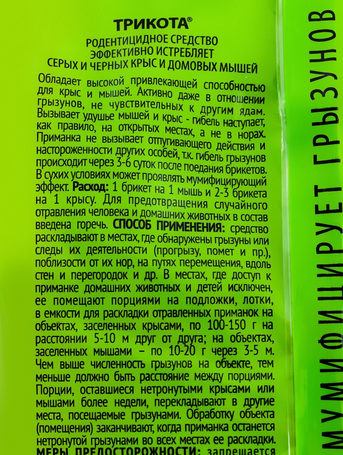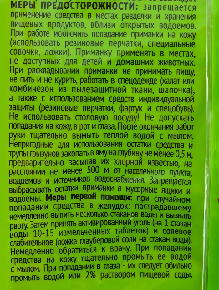 Меры предосторожности: запрещается применение средства в местах разделки и хранения пищевых продуктов, вблизи открытых водоемов, а также в местах, доступных для детей и домашних животных. При работе не курить и не принимать пищу, исключить попадание приманки на кожу (использовать резиновые перчатки, специальные совочки, ложки). По окончании работы тщательно вымыть руки водой с мылом.