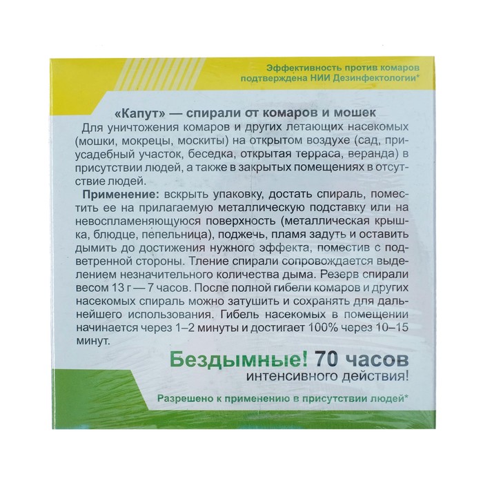 Каждая спираль ""Капут"" имеет высокую эффективность благодаря специальным активным ингредиентам, которые отпугивают насекомых. Они удобны в использовании и могут быть размещены как на открытом воздухе, так и в помещениях, обеспечивая защиту от комаров и мошек в любой ситуации.