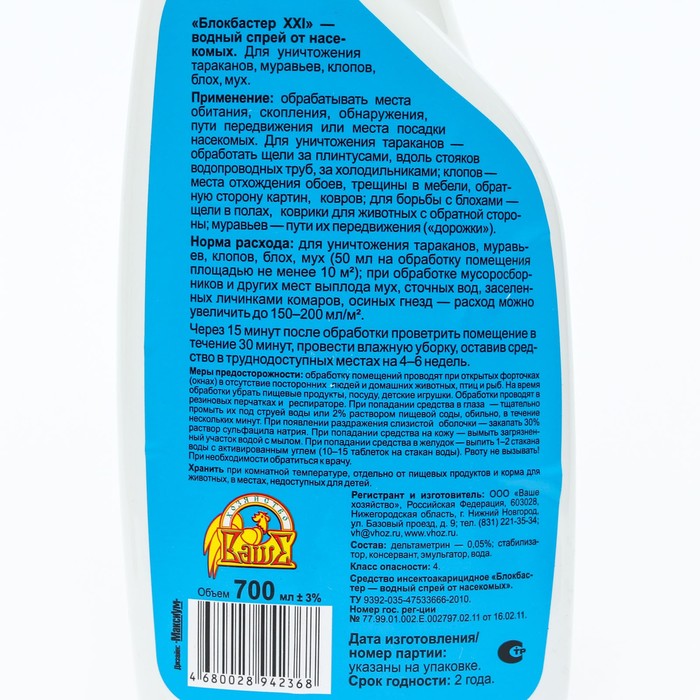 «Блокбастер XXI спрей» — от тараканов и других насекомых. «Блокбастер XXI» — водный спрей от насекомых. Для уничтожения тараканов, муравьев, клопов, блох, мух. Применение: обрабатывать места обитания, скопления, обнаружения, пути передвижения или места посадки насекомых. Для уничтожения тараканов — обработать щели за плинтусами, вдоль стояков водопроводных труб, за холодильниками; клопов — места отхождения обоев, трещины в мебели, обратную сторону картин, ковров; для борьбы с блохами — щели в полах, коврики для животных с обратной стороны; муравьев — пути их передвижения («дорожки»).