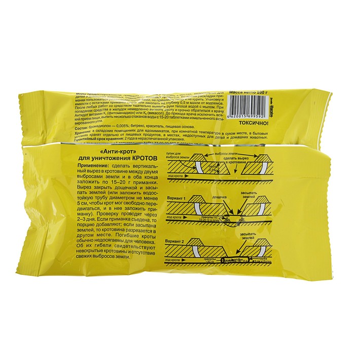 Применение: для борьбы с кротами нужно сделать вертикальный вырез в кротовине между двумя выбросами земли и в оба конца заложить по 15–20 г приманки.