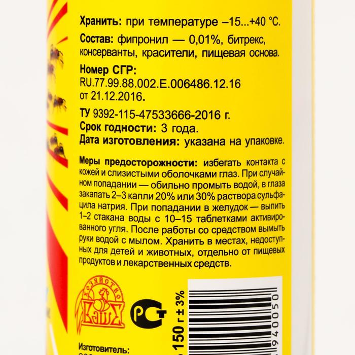 Состав: фипронил — 0,01%, битрекс, консерванты, красители, пищевая основа.