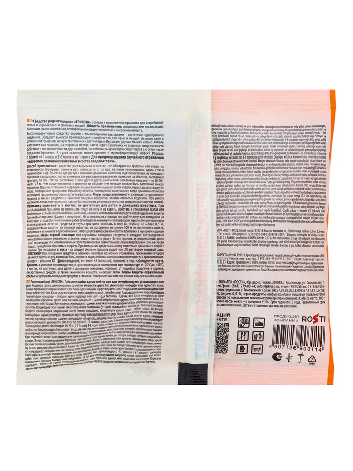 Павших грызунов, использованные подложки, емкости и остатки средства сжечь или закопать в землю на глубину не менее 0,5 м вдали от водоемов. При попадании на кожу смыть теплой водой с мылом. При попадании средства в глаза обильно промыть их водой.