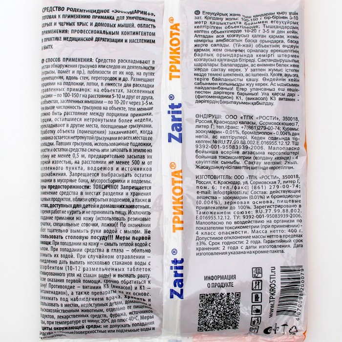 Зерновая приманка Zarit «Истребитель» от крыс и мышей,400 г