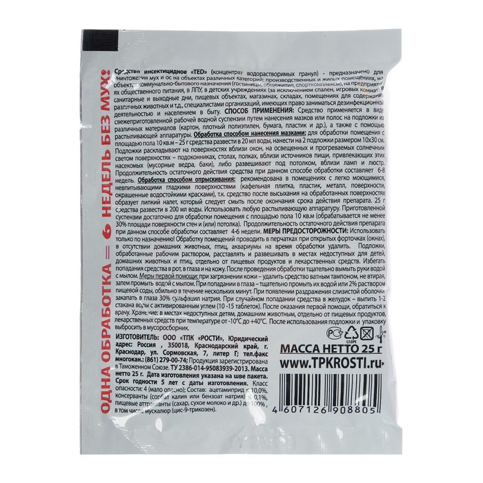 Высокоэффективное средство для уничтожения мух и ос в производственных и жилых помещениях, гостиницах, общежитиях, предприятиях общественного питания, магазинах, складах, животноводческих комплексах и т. д. Препарат содержит особые пищевые аттрактанты, а также половой феромон (химический аттрактант), привлекающий мух на расстоянии – что усиливает привлекательность приманки для насекомых и значительно повышает эффективность. Активное вещество препарата – мощный инсектицид, обладающий почти мгновенным эффектом. Благодаря стабильности действующего вещества, препарат отличается выраженным пролонгированным действием. С целью повышения эффективности препарата и значительного улучшения экономии расходов разработана новая инновационная схема обработки помещений. Метод основывается на применении подложек - метод нанесения мазками. Подложки развешиваются после полного высыхания препарата. Продолжительность остаточного действия средства при данном способе обработки составляет 6-8 недель. Метод нанесения способом опрыскивания рекомендован в помещениях с легко моющимися, не впитывающими гладкими поверхностями. Продолжительность остаточного действия препарата при данном способе обработки составляет 4-6 недель. Раствор препарата при нанесении не оставляет разводов. Состав: ацетамиприд, консерванты, пищевые аттрактанты