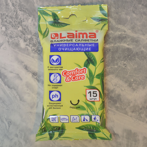 Салфетки влажные 15шт "Универсальные" очищающие, с экстрактом зеленого чая, LAIMA