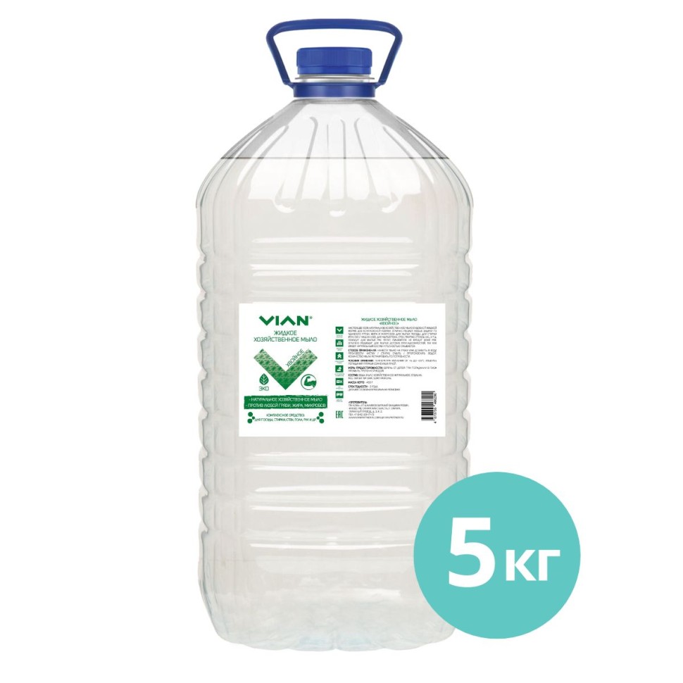 Натуральное жидкое хозяйственное мыло на розлив, тара 5 кг - экономичная упаковка средства. Содержит объём более 11 обычных упаковок жидкого хозяйственного мыла VIAN.
