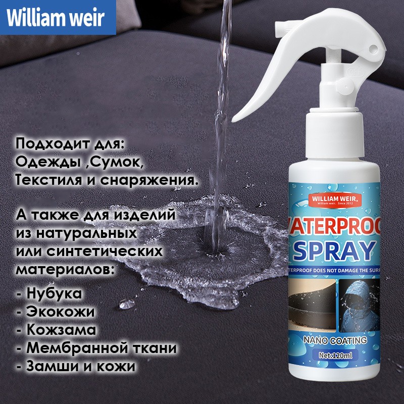 Спрей создает ультратонкое покрытие на каждом отдельном волокне ткани, сохраняя ее водухо- и паропроницаемость и надежно защищая от намокания.