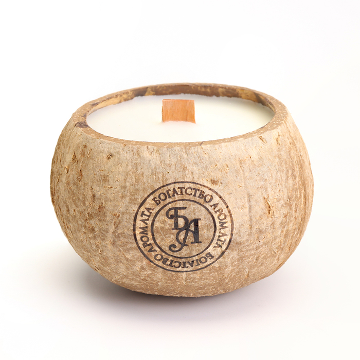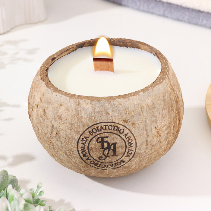 Ароматическая свеча в подсвечнике из кокоса, белый чай, соевый воск, 8×10 см, в коробке