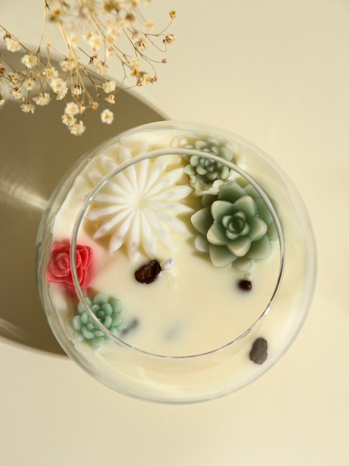 Ароматическая свеча в стильном подсвечнике с мотивом суккулентов наполняет пространство тёплыми нотками кофе и создаёт уютную атмосферу для отдыха и вдохновения. Её белый цвет и лаконичный дизайн гармонично сочетаются с интерьером, добавляя изысканности и природной свежести.