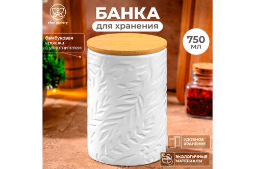 Банка от Elan Gallery предназначена для организации хранения продуктов на вашей кухне. Размер ёмкости – 10х10х11 см, объём – 430 мл. Выполнена из керамики и имеет светло-серый цвет, поверхность украшена рельефным лиственным узором. Крышка выполнена из натурального бамбука и оснащена силиконовым уплотнителем. Изделие отлично подойдёт для хранения сыпучих продуктов: сахара и соли, чая и кофе, приправ и специй. Храните в баночке ягоды, орехи и сухофрукты. Заполните её любимыми сладостями: леденцами, конфетами или печеньем. Подайте к столу, чтобы идеально дополнить чайную сервировку! Герметичная деревянная крышечка защитит ваши продукты от попадания грязи и пыли. Коллекция из трёх баночек нежных природных цветов впишется в любой интерьер и позволит организовать хранение даже на открытых полках. Не рекомендуется применять абразивные моющие средства. Не подходит для использования в микроволновой печи. Без бамбуковой крышки подходит для посудомоечной машины. Бамбук нельзя замачивать! Поставляется в дизайнерской картонной коробке – благодаря ей вам не потребуется дополнительная подарочная упаковка. Это идеальный подарок для хозяйки, ценящей не только практичность, но и стиль. В ассортименте бренда Элан Галерея представлены банки для хранения на любой вкус. Соберите целый набор кухонных контейнеров для эстетичного хранения продуктов на вашей кухне! /