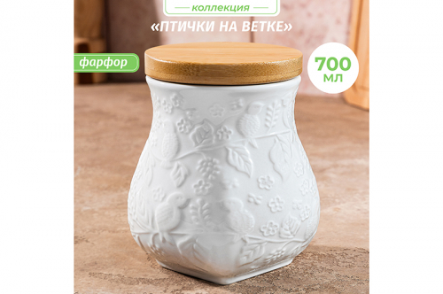 Банка из серии «Тропики» поможет организовать хранение продуктов на вашей кухне. Размер ёмкости – 10,5х10,5х13 см, объём – 700 мл. Выполнена из высококачественного белого фарфора и украшена рельефными узорами в виде тропических листьев. Крышка выполнена из натурального бамбука и оснащена силиконовым уплотнителем, за счёт которого обеспечивается герметичность закрывания и целостность содержимого. Фарфор не впитывает цвет продуктов и надолго сохранит свою белизну. Изящная баночка зауженной формы украсит любой интерьер. Отлично подойдёт для разнообразных сыпучих продуктов: чая, кофе, сахар и соли, припав и специй. Храните в ней крупы, макаронные изделия, а также ягоды, орехи и сухофрукты. Заполните контейнер поштучными сладостями, например, конфетами или леденцами. Подайте баночку к столу, чтобы идеально дополнить чайную сервировку! Благодаря компактному размеру ёмкость найдёт место в любом шкафу и на любой полке. Не рекомендуется применять абразивные моющие средства. Без бамбуковой крышки подойдёт для использования в посудомоечной машине и микроволновой печи. Поставляется в красивой картонной коробке – благодаря ей вам не потребуется дополнительная подарочная упаковка. Это идеальный подарок для хозяйки, ценящей не только практичность, но и стиль. Посуда из серии «Тропики» преобразит вашу кухню и позволит собрать сервиз в едином стиле! /