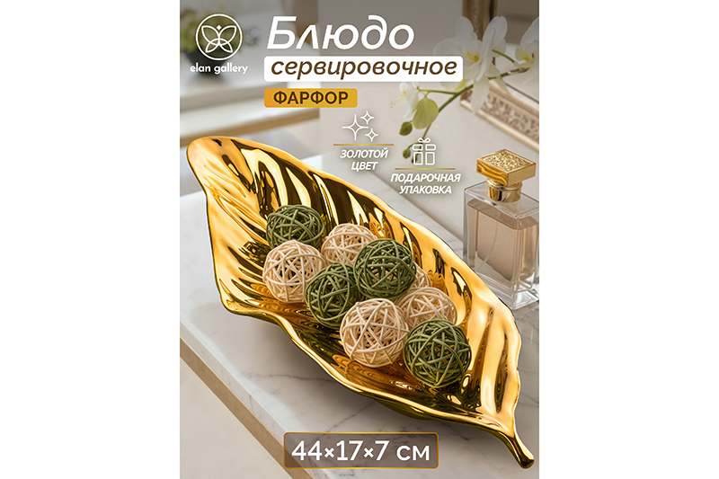 Фигурное сервировочное блюдо «Лист» предназначено для подачи разнообразных угощений и оформления декоративных композиций. Размер изделия – 44,8х17,5х7,7 см. Выполнено из качественного фарфора в форме большого детализированного листика золотого цвета. Фарфор не впитывает цвет продуктов и надолго сохранит свой изначальный вид. Декоративная фарфоровая тарелка украсит любой интерьер благодаря своему необычному дизайну и удивит даже самых привередливых гостей. Подойдёт для подачи сыра и колбасы, а также рыбных и мясных деликатесов. Красиво подайте к столу бутерброды с хлебом и сырной нарезкой. Идеально для сервировки закусок – суши, роллов и канапе, а также салатов, свежих фруктов и овощей. Наполните его десертами и сладостями: конфетами, печеньем, кусочками торта и пирога. Оригинальное блюдо послужит для украшения вашего дома в качестве декора. Поставьте его на тумбочку или полку в качестве самостоятельного декоративного элемента, сделайте частью композиции с искусственными фруктами, сухоцветами и другими предметами, чтобы украсить свой дом и привнести интерьеру изысканности. Не рекомендуется применять абразивные моющие средства. Не подходит для использования в микроволновой печи. Можно использовать в посудомоечной машине. Посуда поставляется в красивой картонной коробке – благодаря ей вам не потребуется дополнительная подарочная упаковка. Это приятный подарок на праздник для хозяйки, ценящей не только практичность, но и стиль. В коллекции бренда Elan Gallery представлено много товаров для создания комфорта и уюта на вашей кухне. Тарелка добавит роскоши вашему дому и создаст праздничную атмосферу даже в будний день! /