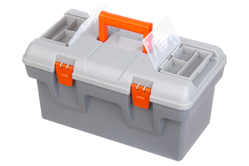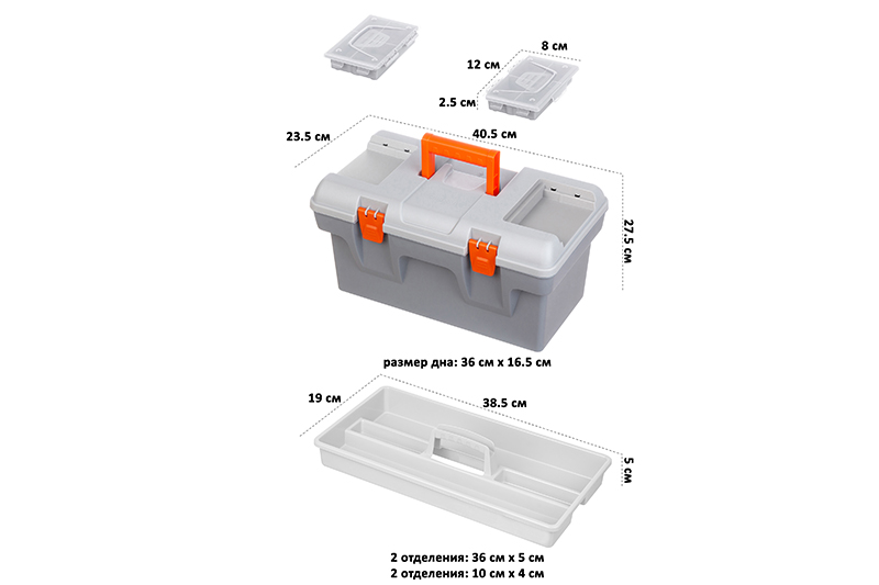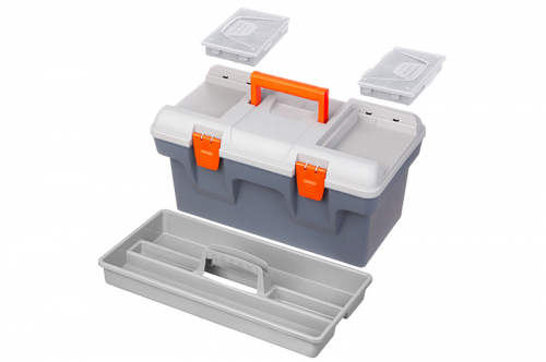 Ящик для инструментов "Массимо"40,5х23,5х21 см выполнен из прочного пластика. Внутри контейнер имеет 2 яруса. Общий объем 16 литров. Верхний ярус-вкладыш 38,5х19х5 см съемный, имеет 4 отделения и ручку. На крышке сверху есть 2 съемных органайзера по 12х8х2,5 см с ячейками для мелочей. Органайзеры имеют по 4 отделения разных размеров. Их будет удобно использовать для болтов, саморезов, гаек, гвоздей, дюбелей. Большой бокс подойдет для хранения основного инструмента - дрель, болгарка, перфоратор и другие. Крышка фиксируется на замок. Ручка складывается. Большой пластиковый кейс пригодится для электриков, сантехников и мастеров по ремонту. Можно использовать как универсальный автомобильный чемоданчик, хранить в нем запасные детали, крепления и приспособления для ремонта авто. Инструментальный бокс не боится влаги, легко отмывается от загрязнений и строительной пыли. Многофункциональный пластмассовый ящик с замком станет удобным дополнением вашего дома, гаража или автомобиля!