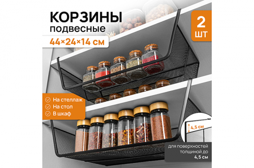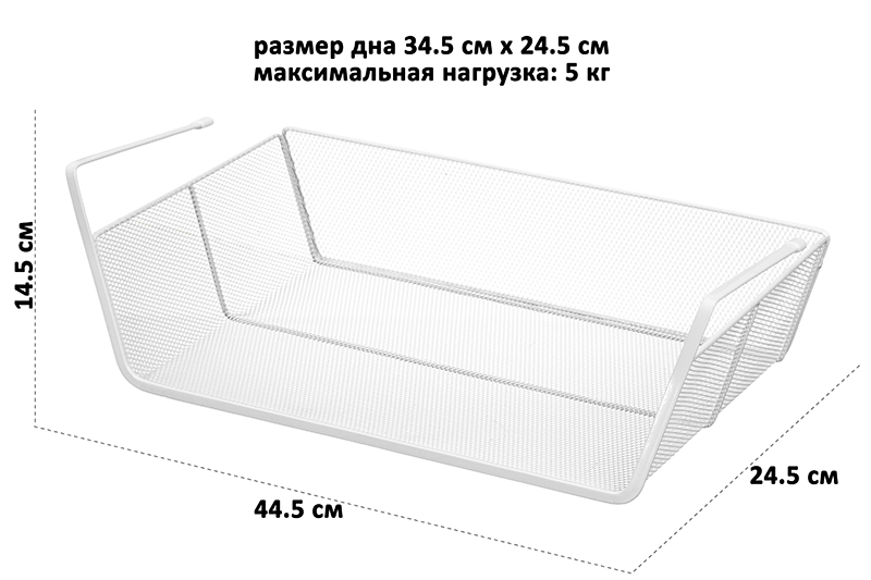 Набор 2 подвесных корзин белого цвета от бренда ELCASA — это компактная система для создания порядка в любом уголке вашего дома: комнате, гардеробной или на кухне. Просто прикрепите органайзер на горизонтальную поверхность, чтобы сделать дополнительную полочку без сверления и сложных крепежей. Размер каждой корзины — 44,5×24,5×14,5 см, её дна — 34,5×24,5 см, максимальная нагрузка на 1 корзинку — 5 кг. Контейнеры выполнены из прочной металлической сетки с пудровым покрытием и легко крепятся к полке или крышке стола толщиной не более 4,5 см. Металл в составе обеспечивает долговечность использования, надежно выдерживает вес книг и журналов. Прямоугольные корзиночки с креплением – это удобное решение для хранения любых вещей: кухонного инвентаря, моющих принадлежностей, а также баночек со специями и приправами. Благодаря универсальному дизайну навесная полочка легко впишется в любой интерьер и позволит держать хозяйственные инструменты или столовые приборы под рукой. Используйте возле раковины как ящик для губок и тряпок, либо повесьте в шкаф — чтобы сложить ремни и мелкую одежду. Подвесной держатель пригодится в прихожей для хранения перчаток и шапок, а в ванной — для аксессуаров и гигиенических принадлежностей. В офисе подойдёт для организации на рабочем месте дополнительного места для документов, канцелярии и различных мелочей. Не рекомендуется применять абразивные моющие средства. В коллекции бренда ELCASA представлено много функциональных товаров для дома, в том числе органайзеров для посуды, овощей и фруктов. Выберите вариант на свой вкус и используйте каждый сантиметр пространства с пользой!