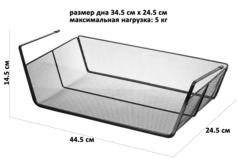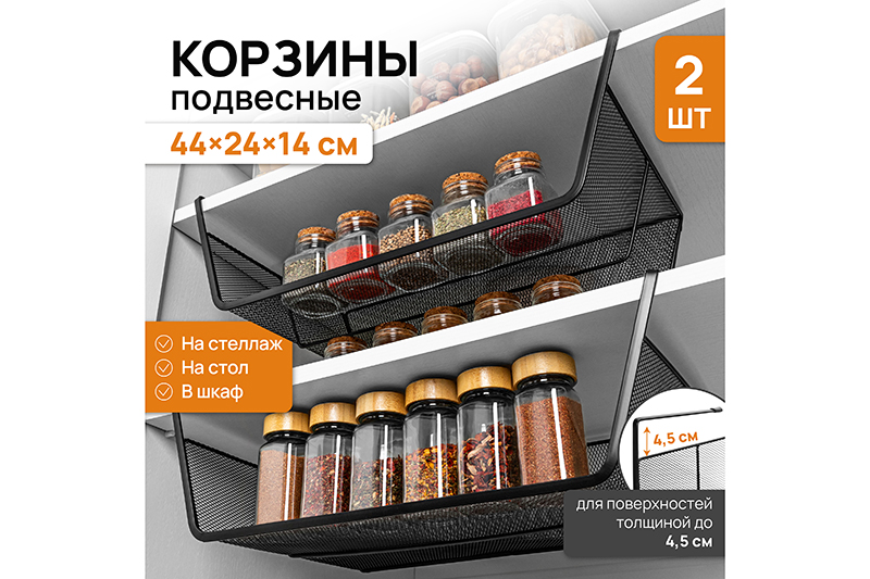 Набор 2 подвесных корзин чёрного цвета от бренда ELCASA — это компактная система для создания порядка в любом уголке вашего дома: комнате, гардеробной или на кухне. Просто прикрепите органайзер на горизонтальную поверхность, чтобы сделать дополнительную полочку без сверления и сложных крепежей. Размер каждой корзины — 44,5×24,5×14,5 см, её дна — 34,5×24,5 см, максимальная нагрузка на 1 корзинку — 5 кг. Контейнеры выполнены из прочной металлической сетки с пудровым покрытием и легко крепятся к полке или крышке стола толщиной не более 4,5 см. Металл в составе обеспечивает долговечность использования, надежно выдерживает вес книг и журналов. Прямоугольные корзиночки с креплением – это удобное решение для хранения любых вещей: кухонного инвентаря, моющих принадлежностей, а также баночек со специями и приправами. Благодаря универсальному дизайну навесная полочка легко впишется в любой интерьер и позволит держать хозяйственные инструменты или столовые приборы под рукой. Используйте возле раковины как ящик для губок и тряпок, либо повесьте в шкаф — чтобы сложить ремни и мелкую одежду. Подвесной держатель пригодится в прихожей для хранения перчаток и шапок, а в ванной — для аксессуаров и гигиенических принадлежностей. В офисе подойдёт для организации на рабочем месте дополнительного места для документов, канцелярии и различных мелочей. В коллекции бренда ELCASA представлено много функциональных товаров для дома, в том числе органайзеров для посуды, овощей и фруктов. Не рекомендуется применять абразивные моющие средства. Выберите вариант на свой вкус и используйте каждый сантиметр пространства с пользой!