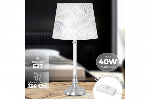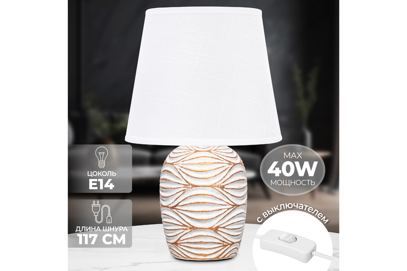 Настольная лампа с белым абажуром от Elan Gallery — это не только дополнительный источник света, но и стильное украшение интерьера спальни или гостиной. Размер – 18х18х30 см. Фигурное основание белого цвета выполнено из керамики и украшено рельефным узором. Диаметр нижней части подставки 7 см. Размеры абажура: диаметр по верху 13 см, диаметр по низу 18 см, высота 15 см. Рекомендуется использовать лампочку мощностью не более 40 W (в комплект не входит). Работает от сети, необходимо наличие розетки. Длина провода 117 см. Имеет стильный дизайн и компактный размер. Маленькая лампа добавит элегантности вашему интерьеру! Декоративный светильник поможет создать уютную атмосферу в комнате или на кухне. Он подходит для использования в качестве ночника, а также прикроватного светильника. Станет отличным предметом декора для вашего комода или журнального столика. Прекрасно впишется в интерьер детской комнаты, создавая уютную атмосферу для школьника. Можно поставить на туалетный столик возле кровати для спокойного чтения книг перед сном. На даче небольшой ночной светильник поможет создать приятную атмосферу на террасе или в доме. Поставьте красивую лампу на стол или тумбочку, чтобы организовать дополнительную подсветку в любом пространстве. Фигурная настольная лампа станет приятным подарком на любой праздник как взрослым, так и детям. Не рекомендуется использовать абразивные моющие средства. Светильник с керамическим основанием — это не просто источник освещения, он украсит интерьер вашего дома и поможет создать уютную атмосферу! В ассортименте Elan Gallery представлено много товаров и предметов декора, которые позволят создать уголок гармонии для комфортного отдыха дома.