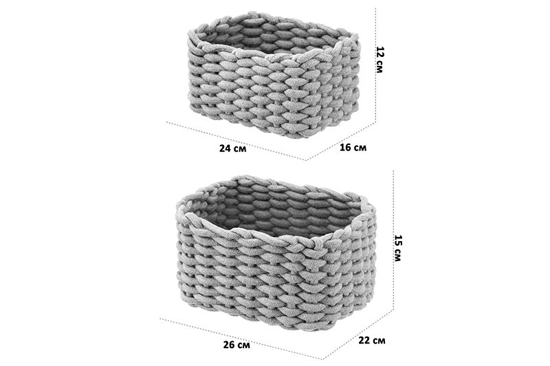 Набор 2 вязаных корзинок от ELCASA поможет создать аккуратную систему хранения в вашем доме. Размер маленького изделия – 24х16х12 см, большого – 26х22х15 см. Выполнены из хлопка и имеют прочный каркас. Эстетичные плетёные корзиночки послужат стильными контейнерами для хранения мелочей, аксессуаров и других вещей. Поставьте их на рабочий стол дома или в офисе в качестве настольных органайзеров, компактно разместите канцелярию или документы. Подойдут для хранения принадлежностей художника, ниток для вышивания, швейного инвентаря и других предметов для творчества. На туалетном столике используйте под косметику, лаков для ногтей, инструментов для макияжа и маникюра. На прикроватном столике храните в них ушные палочки, ватные диски и кремы для рук. Сложите в вязаную корзину провода, подвески, аксессуары и даже принадлежности для рукоделия. Храните в них лекарства. Корзиночки прекрасно впишутся в интерьер кухни или гардеробной. Они послужат и в качестве декоративной детали вашего интерьера. Универсальный дизайн сделает их отличным решением для тех, кто ценит не только функциональность, но и привлекательность. В коллекции бренда ЭЛЬКАСА представлены разнообразные товары для дома, которые привнесут в ваш быт практичности и стиля.