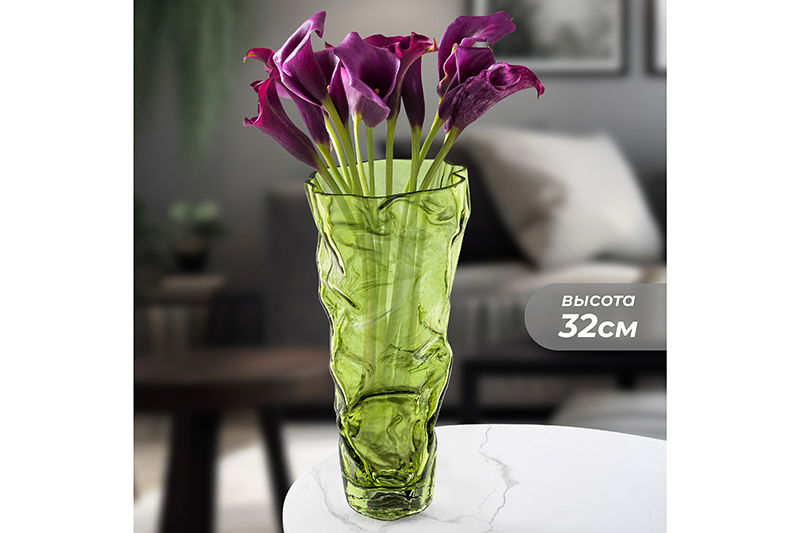 Прозрачная ваза ручной выдувки от Elan Gallery зелёного цвета выполнена из стекла. Объём 2,5 литра, размер 16х16х32 см. Высокая ваза имеет рельефную поверхность с эффектом мятого стекла. Подойдёт для живых и искусственных цветов, веток и сухоцветов. Стильная вазочка послужит элементом декора для вашего дома. В ней красиво будут смотреться букеты из любых цветов или веточек: роз, тюльпанов, вербы. Интерьерная ваза с необычным рельефом украсит комнату даже без наполнения. Подойдёт для оформления декоративных композиций. Эргономичная форма позволит поставить в неё цветы с длинными стеблями, например, каллы. Разместите вазу оригинальной формы на столе или полке, чтобы украсить спальню роскошным букетом гладиолусов или другими растениями! На Новый год и Рождество поставьте в стеклянную вазочку еловые ветки с ёлочными игрушками для создания праздничной атмосферы. Не рекомендуется применять абразивные моющие средства. Поставляется в картонной коробке. Сделайте сюрприз своим близким или коллегам на любой праздник! Предметы декора – хороший подарок как мужчине, так и женщине. Красивый дизайн и функциональность понравятся каждому! Фигурная вазочка станет украшением домашнего интерьера и подчеркнёт красоту любого цветка. В коллекции бренда Elan Gallery можно найти много стильных товаров для дома. Здесь есть всё для создания уюта в квартире и на даче!
