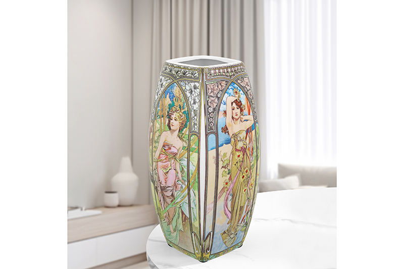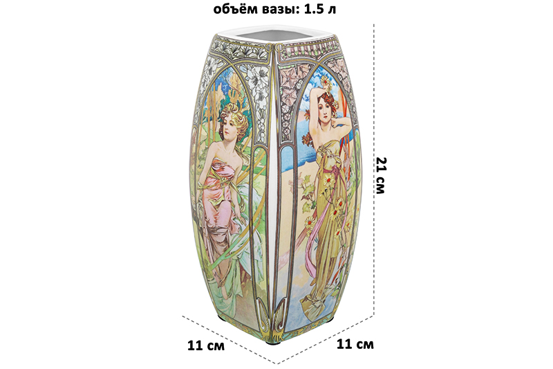 Настольная ваза Elan Gallery "Времена суток" размером 11х11х21 см и объёмом 1,5 литра прямоугольной формы выполнена из фарфора нового поколения new bone china. Благодаря современным технологиям этот вид не уступает традиционному костяному фарфору в прочности, но гораздо экологичнее в производстве. В коллекции бренда Elan Gallery можно найти много красивой посуды и предметов декора с изображениями по мотивам шедевров мировой живописи! Высокая вазочка украшена репродукциями картин и панно чешского художника Альфонса Мухи. На каждой стороне фарфорового изделия изображены девушки, символизирующие 4 времени суток. Яркий и узнаваемый сюжет удачно впишется в любой стиль интерьера, добавляя красоты и романтики. Интерьерная ваза подойдёт для размещения букетов, искусственных цветов или сухоцветов. Она послужит элементом декора вашего дома и поможет украсить его любыми растениями. Как красиво будут смотреться букеты из живых цветов и веточек на кухне и в любой комнате! Поставьте на видное место розы, тюльпаны или вербу для оформления интерьера в квартире. Интерьерная ваза украсит комнату даже без наполнения и подойдёт для создания декоративных композиций на журнальном столике или полке. Эргономичная форма позволит поставить в неё цветы с длинными стеблями. Не рекомендуется применять абразивные моющие средства. Поставляется в прочной красочной коробке. Станет шикарным подарком вашим близким на любой праздник. Благодаря стильной коробочке вам не понадобится дополнительная подарочная упаковка. Сделайте сюрприз ценителям искусства! Красивая фарфоровая ваза с рисунком станет украшением вашего дома и подчеркнёт красоту любого цветка. Ознакомьтесь с другими товарами для дома от Elan Gallery, здесь вы найдёте всё для создания домашнего уюта!