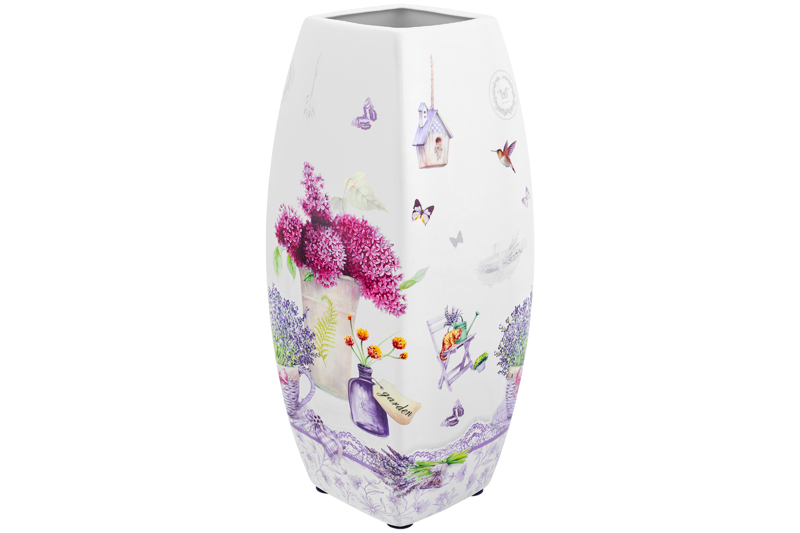 Настольная ваза Elan Gallery "Лаванда" размером 11,5х11,5х26 см и объёмом 2,2 литра прямоугольной формы выполнена из фарфора нового поколения new bone china. New bone china сочетает в себе изящность и высокую прочность. От других видов костяного фарфора материал отличается большей экологичностью в производстве. Вазочка имеет маленькие антискользящие накладки с обратной стороны дна для устойчивости на гладкой поверхности. Серия "Лаванда" украшена нежным принтом на тему Прованса – французской провинции, которая славится своими лавандовыми полями и красивыми пейзажами. Изображение пышных букетов лаванды и гортензии позволит окунуться в атмосферу тепла, гармонии и южного солнца, не покидая вашего дома! Высокая вазочка удачно впишется в любой стиль интерьера, добавляя красоты и романтики. Интерьерная ваза подойдёт для размещения букетов, искусственных цветов или сухоцветов. Она послужит элементом декора вашего дома и поможет украсить его любыми растениями. Как красиво будут смотреться букеты из живых цветов и веточек на кухне и в любой комнате! Поставьте на видное место розы, тюльпаны или вербу для оформления интерьера в квартире. Интерьерная ваза украсит комнату даже без наполнения и подойдёт для создания декоративных композиций на журнальном столике или полке. Эргономичная форма позволит поставить в неё цветы с длинными стеблями. Не рекомендуется применять абразивные моющие средства. Поставляется в прочной красочной коробке. Станет шикарным подарком вашим близким на любой праздник. Благодаря стильной коробочке не понадобится подарочная упаковка. Красивая фарфоровая ваза с рисунком станет украшением вашего дома и подчеркнёт красоту любого цветка. Ознакомьтесь с другими товарами для дома от Elan Gallery, здесь вы найдёте всё для создания домашнего уюта!