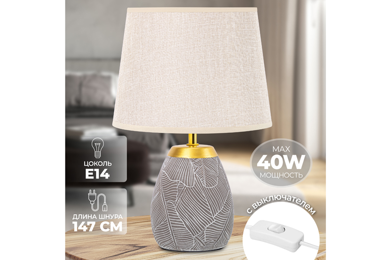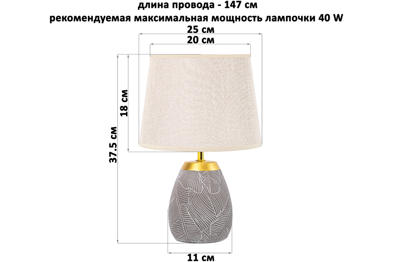 Настольная лампа с бежевым абажуром от Elan Gallery — это не только дополнительный источник света, но и стильное украшение интерьера спальни или гостиной. Размер – 25х25х37,5 см. Основание выполнено из керамики, диаметр нижней части подставки 11 см. Размеры абажура: диаметр по верху 20 см, диаметр по низу 25 см, высота 18 см. Рекомендуется использовать лампочку мощностью не более 40 W (в комплект не входит). Работает от сети, необходимо наличие розетки. Длина провода 147 см. Имеет стильный дизайн: керамическое основание украшено рельефным узором, напоминающим тропические листья. Добавьте гармонии природы домашнему пространству! Декоративный светильник поможет создать уютную атмосферу в комнате или на кухне. Он подходит для использования в качестве ночника, а также прикроватного светильника. Станет отличным предметом декора для вашего комода или журнального столика. Лампа прекрасно впишется в интерьер детской комнаты, создавая уютную атмосферу для школьника. Можно поставить на туалетный столик возле кровати для спокойного чтения книг перед сном. На даче ночной светильник поможет создать приятную атмосферу на террасе или в доме. Поставьте красивую лампу на стол или тумбочку, чтобы создать дополнительную подсветку в любом пространстве. Фигурная настольная лампа станет приятным подарком на любой праздник как взрослым, так и детям. Не рекомендуется использовать абразивные моющие средства. Светильник с керамическим основанием и бежевым абажуром — это не просто источник освещения, он украсит интерьер вашего дома и поможет создать уютную атмосферу! В ассортименте Elan Gallery представлено много товаров и предметов декора, которые позволят создать уголок гармонии для комфортного отдыха дома.