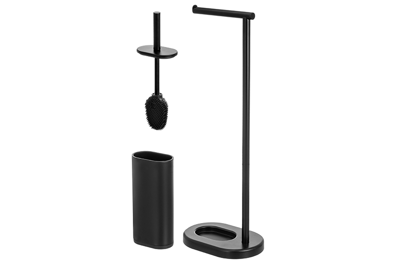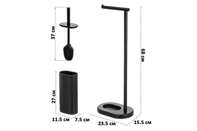 Подставка для туалетной бумаги с ёршиком от бренда ELCASA "Чёрная" общим размером 23,5х15,5х68 см выполнена из металла с пудровым покрытием и имеет пластиковые элементы. Вертикальный металлический держатель с подвесом для рулона имеет несгибаемую форму. Горизонтальный подвес для рулона вертикально не поднимается. Овальное основание (подставка) держателя выполнена из пластика. Ёрш с силиконовой щёточкой помещён в двойной контейнер размером 11,5х7,5х27 см. Внешняя часть контейнера выполнена из металла, внутренняя вставка – из пластика. Весь двойной контейнер снимается с подставки, поэтому его легко мыть. Поскольку мягкая щётка у ёршика выполнена из силикона, она легко удаляет загрязнения, не оставляет царапины на поверхности унитаза и легко отмывается. Длина ручки ёршика до овального пластикового элемента 11 см, общий размер ёршика с ручкой 37х4 см. Стильный напольный держатель подойдет к любому интерьеру ванной или туалета, от минимализма до лофт. За счёт эргономичной формы вертикальному органайзеру найдется место даже в небольшой кабинке туалета. Высокая стойка из металла с пластиковыми элементами устойчива на полу и не требует дополнительных действий при установке. Просто поставьте её на пол в санузел рядом с унитазом без всякого сверления. Все необходимые предметы гигиены будут под рукой. Не рекомендуется применять абразивные моющие средства. Поставляется в красочной картонной коробке. Бумагодержатель станет незаменимым помощником для создания комфорта в вашем доме! В коллекции бренда ELCASA представлено много функциональных товаров и стильных аксессуаров для вашего дома, которые позволят создать комфорт и уют в любом пространстве.