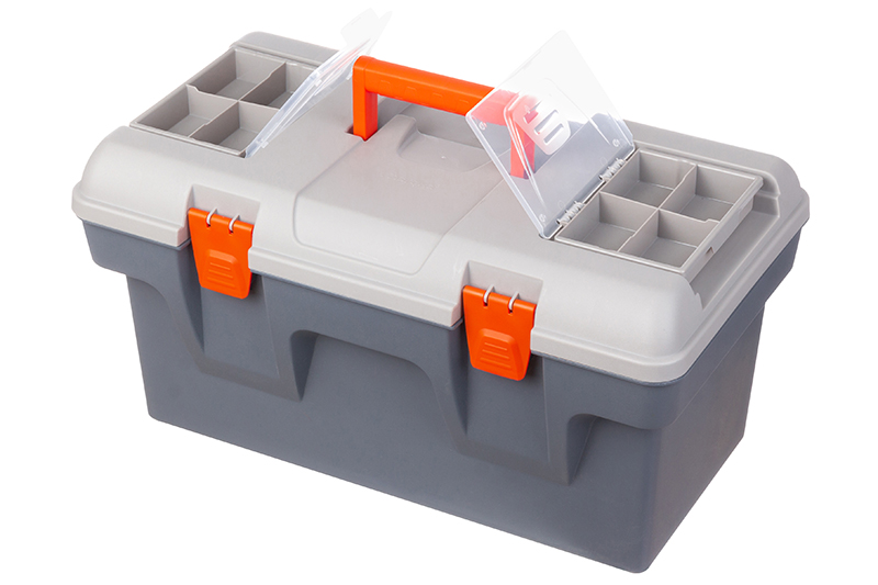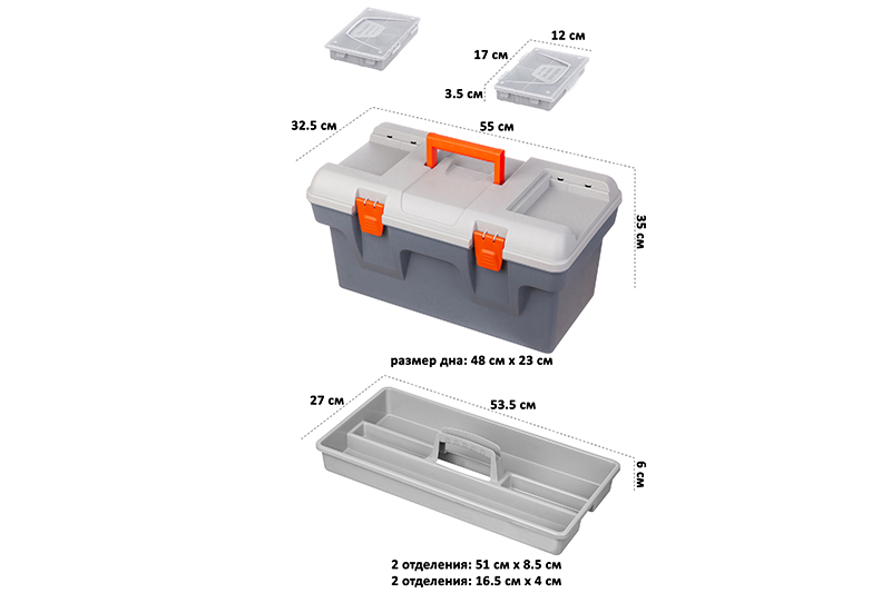 Ящик для инструментов "Массимо"55х32,5х29 см выполнен из прочного пластика. Внутри контейнер имеет 2 яруса. Общий объем 22 литра. Верхний ярус-вкладыш 53,5х27х6 см съемный, имеет 4 отделения и ручку. На крышке сверху есть 2 съемных органайзера по 17х12х3,5 см с ячейками для мелочей. Органайзеры имеют по 4 отделения разных размеров. Их будет удобно использовать для болтов, саморезов, гаек, гвоздей, дюбелей. Большой бокс подойдет для хранения основного инструмента - дрель, болгарка, перфоратор и другие. Крышка фиксируется на замок. Ручка складывается. Большой пластиковый кейс пригодится для электриков, сантехников и мастеров по ремонту. Можно использовать как универсальный автомобильный чемоданчик, хранить в нем запасные детали, крепления и приспособления для ремонта авто. Инструментальный бокс не боится влаги, легко отмывается от загрязнений и строительной пыли. Многофункциональный пластмассовый ящик с замком станет удобным дополнением вашего дома, гаража или автомобиля!