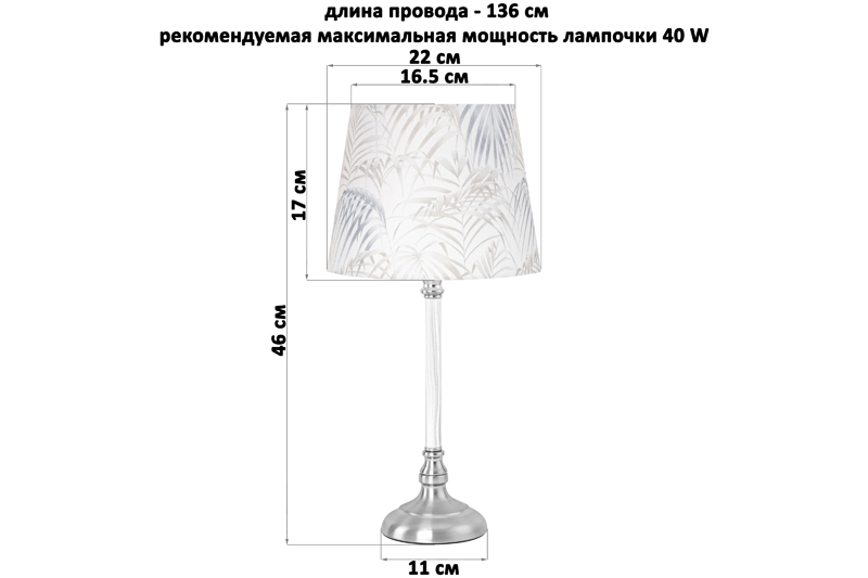 Настольная лампа с абажуром белого цвета от Elan Gallery — это не только дополнительный источник света, но и стильное украшение интерьера спальни или гостиной. Размер – 22х22х46 см. Фигурное основание серебряного цвета выполнено из металла. Диаметр нижней части подставки 11 см. Размеры абажура: диаметр по верху 16,5 см, диаметр по низу 22 см, высота 17 см. Рекомендуется использовать лампочку мощностью не более 40 W (в комплект не входит). Работает от сети, необходимо наличие розетки. Длина провода 136 см. Имеет стильный дизайн: абажур украшен рисунком с тропическими листьями. Декоративный светильник поможет создать уютную атмосферу в комнате или на кухне. Он подходит для использования в качестве ночника, а также прикроватного светильника. Станет отличным предметом декора для вашего комода или журнального столика. Прекрасно впишется в интерьер детской комнаты, создавая уютную атмосферу для школьника. Можно поставить на туалетный столик возле кровати для спокойного чтения книг перед сном. На даче ночной светильник поможет создать приятную атмосферу на террасе или в доме. Поставьте красивую лампу на стол или тумбочку, чтобы организовать дополнительную подсветку в любом пространстве. Фигурная настольная лампа станет приятным подарком на любой праздник как взрослым, так и детям. Не рекомендуется использовать абразивные моющие средства. Светильник с металлическим основанием серебристого цвета — это не просто источник освещения, он украсит интерьер вашего дома и поможет создать уютную атмосферу! В ассортименте Elan Gallery представлено много товаров и предметов декора, которые позволят создать уголок гармонии для комфортного отдыха дома.