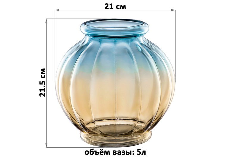 Круглая ваза ручной выдувки размером 21х21х21,5 см и объёмом 5 литров выполнена из прочного бежево-голубого стекла. Вазочка подойдёт для размещения живых и искусственных цветов, сухоцветов и веточек. Её широкое горлышко вместит даже пышный букет или цветочную композицию. Полупрозрачная ваза имеет бежево-голубой цвет и украшена крупным рельефом, напоминающим апельсиновые дольки. Она идеально дополнит интерьер вашей квартиры и украсит любую комнату. Утолщённое дно обеспечивает устойчивость вазы. Её можно разместить в гостиной, на кухне или в прихожей. Декоративная ваза поможет создать в доме праздничную атмосферу. Не рекомендуется применять абразивные моющие средства. Поставляется в прочной картонной коробке. Такая ваза станет идеальным подарком для любой женщины!