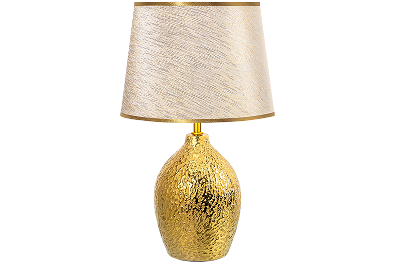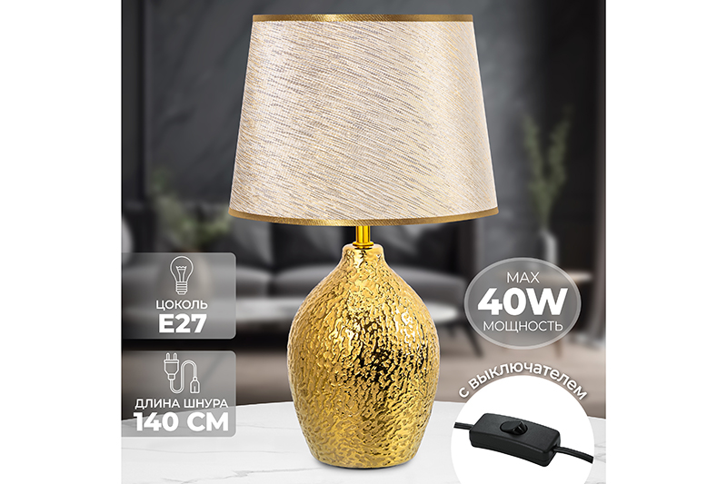 Настольная лампа от Elan Gallery — это не только дополнительный источник света, но и стильное украшение интерьера спальни или гостиной. Размер – 25х25х42,5 см. Абажур белого цвета украшен золотистым окаймлением. Фигурное основание выполнено из керамики, имеет рельефную поверхность золотого цвета. Диаметр нижней части подставки 9 см. Размеры абажура: диаметр по верху 20 см, диаметр по низу 25 см, высота 18 см. Рекомендуется использовать лампочку мощностью не более 40 W (в комплект не входит). Работает от сети, необходимо наличие розетки. Длина провода 140 см. Добавит роскоши домашнему пространству благодаря золотым элементам в дизайне. Декоративный светильник поможет создать уютную атмосферу в комнате или на кухне. Он подходит для использования в качестве ночника, а также прикроватного светильника. Станет отличным предметом декора для вашего комода или журнального столика. Лампа прекрасно впишется в интерьер детской комнаты, создавая уютную атмосферу для школьника. Можно поставить на туалетный столик возле кровати для спокойного чтения книг перед сном. На даче ночной светильник поможет создать приятную атмосферу на террасе или в доме. Поставьте красивую лампу на стол или тумбочку, чтобы создать дополнительную подсветку в любом пространстве. Фигурная настольная лампа станет приятным подарком на любой праздник как взрослым, так и детям. Не рекомендуется использовать абразивные моющие средства. Светильник с керамическим основанием и золотым рисунком на абажуре — это не просто источник освещения, он украсит интерьер вашего дома и поможет создать уютную атмосферу! В ассортименте Elan Gallery представлено много товаров и предметов декора, которые позволят создать уголок гармонии для комфортного отдыха дома.