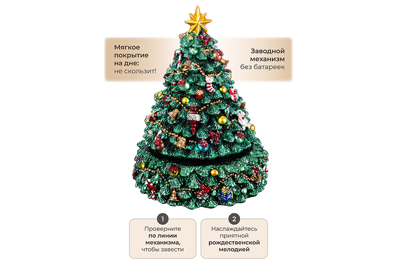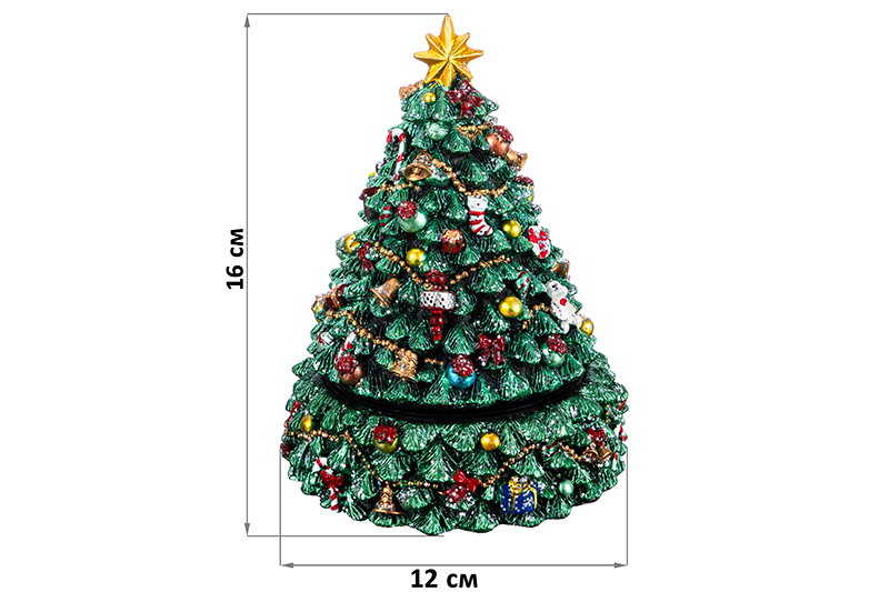 Музыкальная карусель «Рождественская ель» от Elan Gallery – это маленькое путешествие в дивный мир зимней сказки. Её размер – 12x12x16 см. Выполнена из полистоуна – современного материала, который славится своей прочностью, износостойкостью и устойчивостью к перепадам температур. Он не подвержен деформации и не выделяет вредных веществ. Полистоун легко поддаётся обработке, поэтому изделия из него отличаются высокой детализацией. На красивой зелёной ёлке развешаны новогодние украшения: шары, конфеты и другие символы праздника. Поверхность присыпана блёстками, напоминающими снежинки. Верхушку венчает большая золотая звезда. Основание оснащено мягким противоскользящим покрытием. Механическое изделие не требует зарядки и батареек – достаточно повернуть верхнюю часть ёлки по линии механизма. Крутящаяся фигурка проигрывает приятную рождественскую музыку, навевая воспоминания о тёплых вечерах, проведённых в кругу семьи. Время – 3-4 минуты в зависимости от силы завода. Поставьте милую настольную фигурку на комод, полку или возле компьютера, чтобы добавить интерьеру дух любимых зимних праздников. Оригинальная игрушка в стиле винтаж станет прекрасным сувениром на память и отличным подарком для друзей и близких. Благодаря яркому дизайну фигурное декоративное изделие понравится ребёнку, подростку или взрослому. Подойдёт как девочке, так и мальчику. Оно послужит необычным инвентарём для декора вашего дома. Поставляется в красной картонной коробке – благодаря ей вам не потребуется дополнительная подарочная упаковка. Музыкальная карусель от бренда Элан Галерея поможет вам погрузиться в атмосферу Нового года и Рождества и наполнит дом уютом и светлой праздничной магией!
