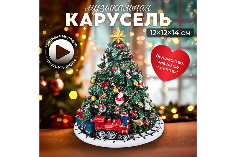 Музыкальная карусель «Рождественская ель» от Elan Gallery – это маленькое путешествие в дивный мир зимней сказки. Её размер – 12x12x14,5 см. Выполнена из полистоуна – современного материала, который славится своей прочностью, износостойкостью и устойчивостью к перепадам температур. Он не подвержен деформации и не выделяет вредных веществ. Полистоун легко поддаётся обработке, поэтому изделия из него отличаются высокой детализацией. На красивой зелёной ёлке развешаны новогодние украшения: шары, конфеты и другие символы праздника. Верхушку венчает большая золотая звезда. Поверхность присыпана блёстками, напоминающими снежинки. Под елью проложена игрушечная железная дорога с красочным поездом. Благодаря тому, что фигурка плавно вращается по направлению движения поезда, кажется, будто композиция оживает. Механическое изделие не требует зарядки и батареек – достаточно повернуть круглый рычаг в основании. Это удобно сделать благодаря двум выемкам для пальцев. Крутящаяся фигурка проигрывает приятную рождественскую музыку, навевая воспоминания о тёплых вечерах, проведённых в кругу семьи. Время – 3-4 минуты в зависимости от силы завода. Поставьте милую настольную фигурку на комод, полку или возле компьютера, чтобы добавить интерьеру дух любимых зимних праздников. Оригинальная игрушка в стиле винтаж станет прекрасным сувениром на память и отличным подарком для друзей и близких. Благодаря яркому дизайну фигурное декоративное изделие понравится ребёнку, подростку или взрослому. Подойдёт как девочке, так и мальчику. Оно послужит необычным инвентарём для декора вашего дома. Поставляется в красной картонной коробке – благодаря ей вам не потребуется дополнительная подарочная упаковка. Музыкальная карусель от бренда Элан Галерея поможет вам погрузиться в атмосферу Нового года и Рождества и наполнит дом уютом и светлой праздничной магией!